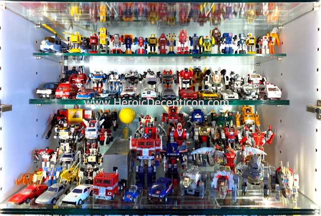 The above pic shows a stand-alone shelf opposite the long large ones. This showcases the pieces that are either very special or close to heart. Top shelf contains the trinity of holy grail gift sets, the VSX, VSY and VSZ, all of which are pristine and unused. One shelf down are Hottoys figures some of which belongs to E. Then, we have all 18 of the 1984 and 1985 original Autobots "cars" and in package (also unused) versions of the Season 1 Decepticons.